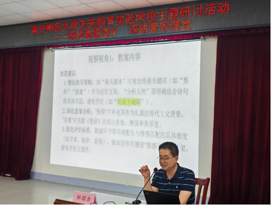 专家邹国金从三个视角展开:教案内容以古诗联读为载体,具情境驱动等亮点,但需细化指导、深化意象分析与优化评价标准;CSMS大数据分析显示,课堂情感饱满、互动充分,但存在思维深度不足、语言凝练度待提升及学习风格兼顾不均衡等问题;学理分析强调AI辅助地位、语文特色及课程标准要求,点明教学应一课一得,注重诵读,避免繁琐分析,并明确教学目标、重难点。